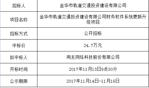 金華市軌道交通投資建設有限公司財務軟件系統(tǒng)更新升級項目中標公示