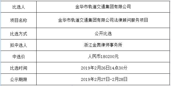 (金華市軌道交通集團(tuán)有限公司法律顧問服務(wù)項(xiàng)目)中選公示