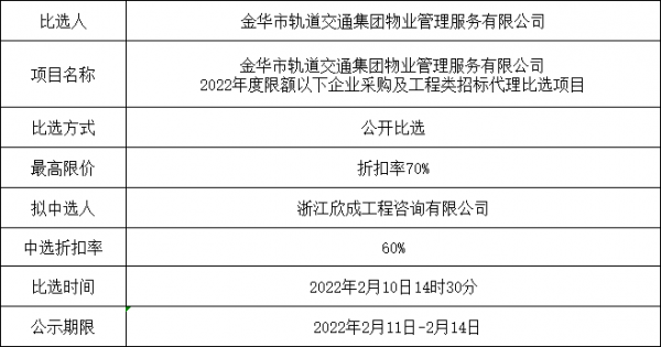 金華市軌道交通集團(tuán)物業(yè)管理服務(wù)有限公司2022年度限額以下企業(yè)采購及工程類招標(biāo)代理比選項(xiàng)目中選公示