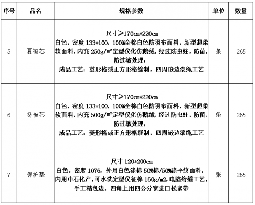 三、用戶需求書中附件1《司機公寓床品需求明細表》序號5、序號6、序號7規(guī)格參數修改如下,其余未修改項仍按原比選文件執(zhí)行: