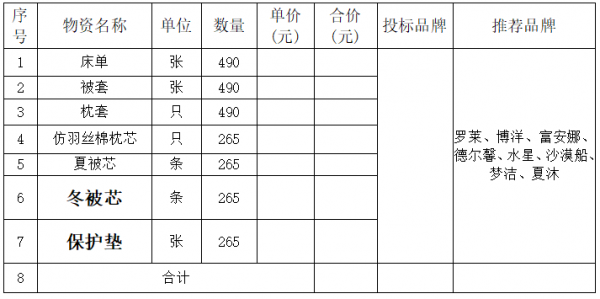 致:各參選人 比選人現將參選人提出的問題及招標文件需要澄清、修改、補遺、答疑的內容,統(tǒng)一答復你們,請認真研究。本次澄清、修改、補遺、答疑若與招標文件不一致之處,以本次補充文件為準。一、問:報價明細表中有推薦品牌,其他品牌是否可以參與? 推薦品牌均為家紡產品的品牌,而貴公司所需產品均為酒店布草產品,與家紡產品存在差異,且一般酒店布草的同質量產品在技術標準上均優(yōu)于甲方產品。建議貴公司可以放開參與品牌的范圍,允許類似我司這樣的專業(yè)酒店布草生產廠家參加。答:甲方推薦品牌的,供貨產品品牌須在技術需求中推薦品牌范圍內或相當于(或優(yōu)于)推薦品牌。